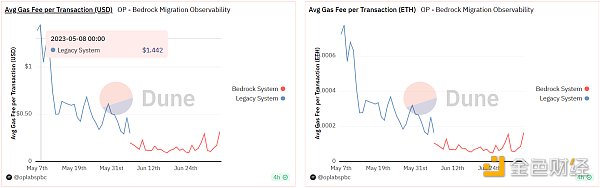 此外,在網絡性能方面,Optimism 也一直在優化提升。今年 6 月份,Optimism 宣布完成主網 Bedrock 升級,進一步降低交易費用、縮短存款確認時間,提升了性能。根據 Dune 數據顯示,自完成 Bedrock 升級后,Optimism 平均每筆交易 Gas 費用下降了大約 75%,其中 Optimism 主網成為 Token 兌換中最便宜的以太坊 L2 網絡,現每筆交易 Gas 費約 0.1 美元。