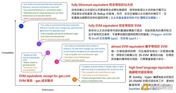目前,zkRollup 系網絡主要以兼容以太坊 EVM 為主,其兼容性按照 V 神的《The different types of ZK-EVMs 不同類型的 ZK-EVM》博客內容可劃分為四類:完全等效以太坊、完全等效 EVM、幾乎等效于 EVM 和高級程序式語言等效。