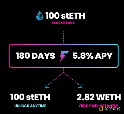 Flashstake為用戶提供了收益方面的靈活性,允許用戶在設定的期限內以固定利率立即獲得存入資產的預付收益。例如,如果將100個stETH質押180天,那么Flashstake協議會立馬給你2.82個WETH,年化收益大概5.8%左右。