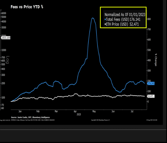 今年以來,以太坊 L1 每日費用收入(以美元計)上漲了 176%,而 ETH 價格僅上漲了 53%。兩者之間的關系對上一次牛市具有啟發意義,當時費用在經歷了兩年的下降后于 2020 年超過了價格(指費用漲幅超過了價格漲幅)。