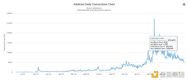 例如,2023 年 5 月 5 日,由于以太坊 Gas 費用激增,Arbitrum 批量提交給以太坊的交易需要支付大量 Gas(353.93 ETH),盡管以太坊上僅涉及 1369 筆交易,交易量還不到 100 萬筆。 Arbitrum 上的交易。