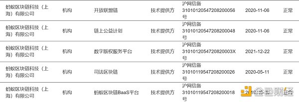 上述幾個圖片顯示可以看出,基本上這些聯盟鏈也都進行了區塊鏈備案。例如螞蟻鏈區塊鏈備案齊全:
