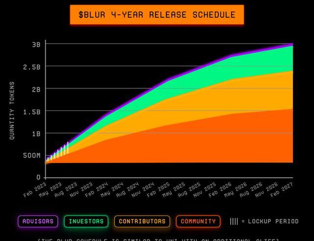 核心貢獻者和啟動合作伙伴分配的BLUR代幣將按照相同的時間表歸屬,并增加了4個月的懸崖。顧問的BLUR分配將在48至60個月內歸屬,并設置4至16個月的懸崖。釋放速度具體為第一年釋放總供應量的40%,第二年釋放總供應量的30%,第三年釋放總供應量的20%,第四年釋放總供應量的10%。