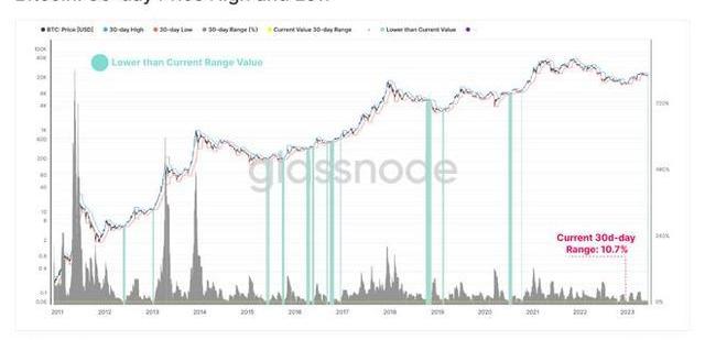 在圖表中,這家分析公司還強調了30天范圍比目前觀察到的交易日更窄的交易日。正如預期的那樣,看起來這種趨勢發生的情況并不多。
