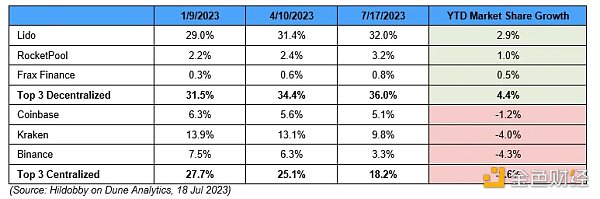 我們預計,在中心化參與者提供的質押服務受到增加的監管審查的背景下,流動質押領域將受益。截至目前,排名前三的中心化質押服務提供商已經放棄了 9.6% 的市場份額,這部分份額已經被其去中心化對手部分吸收。值得注意的是,Lido 一直是這一趨勢的最大受益者,市場份額增長了 2.9% 。我們相信,這表明由于 stETH 在 DeFi 中的流動性和可組合性,它仍然是大多數質押者的首選之一。