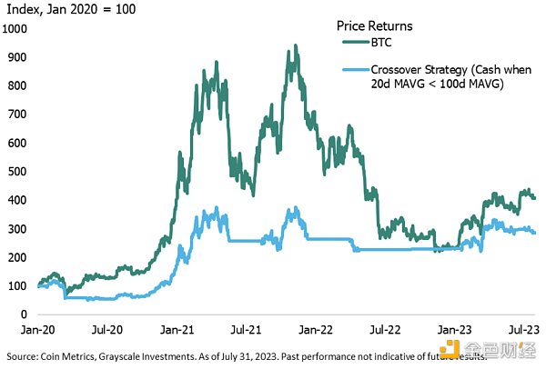從 2012 年至今,20 天/100 天移動平均線交叉策略的表現也優于買入并持有比特幣配置。該策略的年化回報率為 116%,夏普比率為 1.7,而買入并持有策略的年化回報率為 110%,夏普比率為 1.3。回測交叉策略的結果在不同時期略有不同。例如,在 2020 年至 2023 年期間,與買入并持有比特幣頭寸相比,這些策略產生了更好的風險調整回報,但總回報較低(圖表 5)。在某些時期,風險的降低是以回報率降低為代價的。