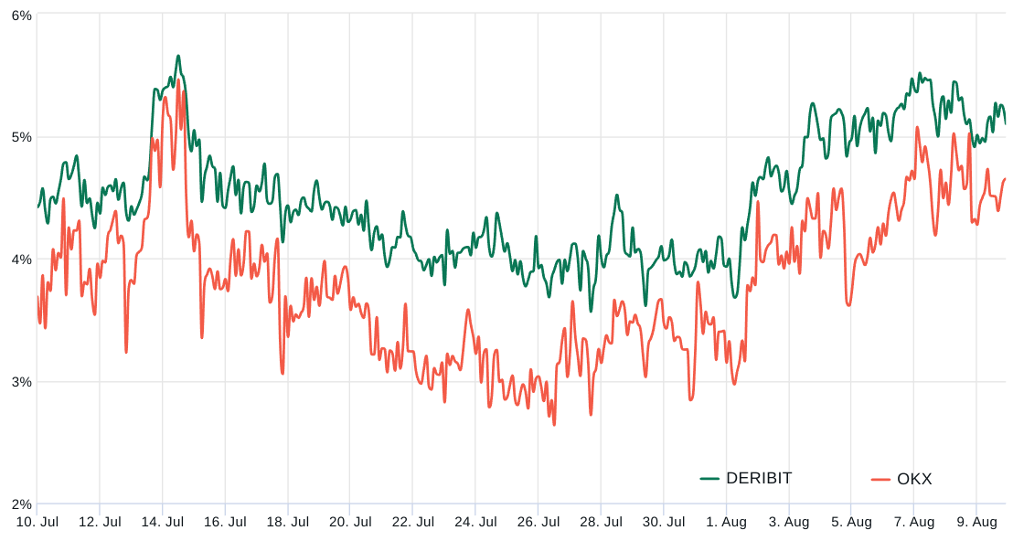 根據期貨溢價(也稱為基差指標),自 7 月 16 日以來,以太坊市場的專業交易者仍然無法采取看漲立場。目前 5% 的水平徘徊在中性至看跌閾值的邊緣,表明杠桿多頭和空頭頭寸之間的需求平衡狀態。