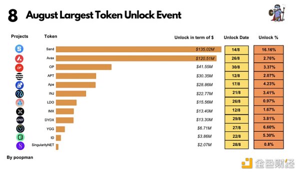 今年8月份一共會有23個解鎖事件。其中,SAND、AVAX、APT等規模較大的解鎖值得我們關注。