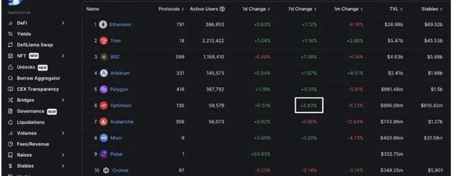 上圖顯示了Optimism在過去7天有TVL增長,那么鏈條上的dapp是什么吸引增長,點擊Optimism鏈,然后單擊7d以安排逐步增加變化的更改。