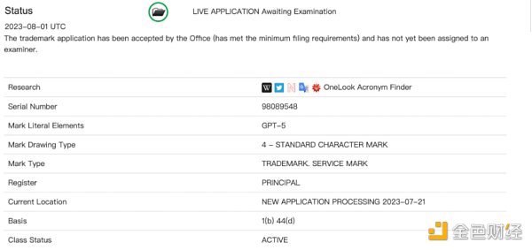 而最近,美國專利商標局 (USPTO) 披露的一份文件顯示:OpenAI于7月18日提交了「GPT-5」的商標申請。并且已經被接收。