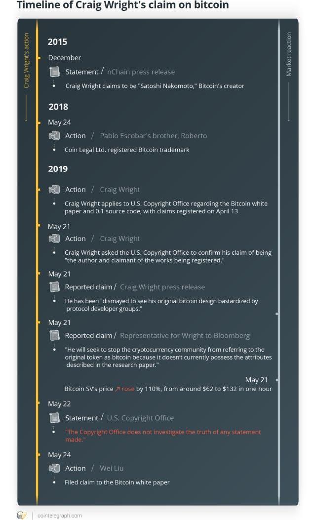 5月21日,賴特的法律代表對比特幣白皮書以及協議的早期代碼提出了版權要求,這是他“證明”自己是中本聰的最新努力。
