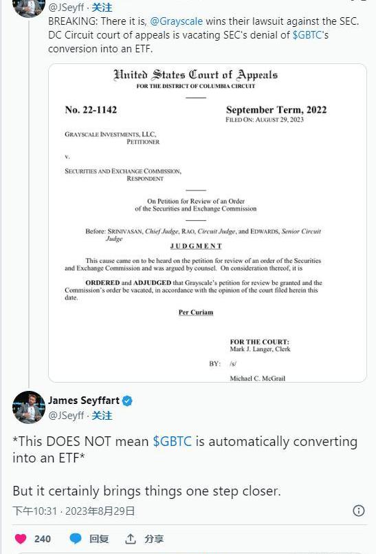 不過,雖然法院的判決震撼了整個幣圈,但這并非就已經是最終的勝利,許多專家也認為SEC很有可能會再提出上訴。彭博ETF分析師詹姆斯·塞法特在推特上也表示,灰度雖然贏得了訴訟,但這并不代表GBTC可以轉換成ETF,只是讓申請轉換一事向前邁進了一大步。