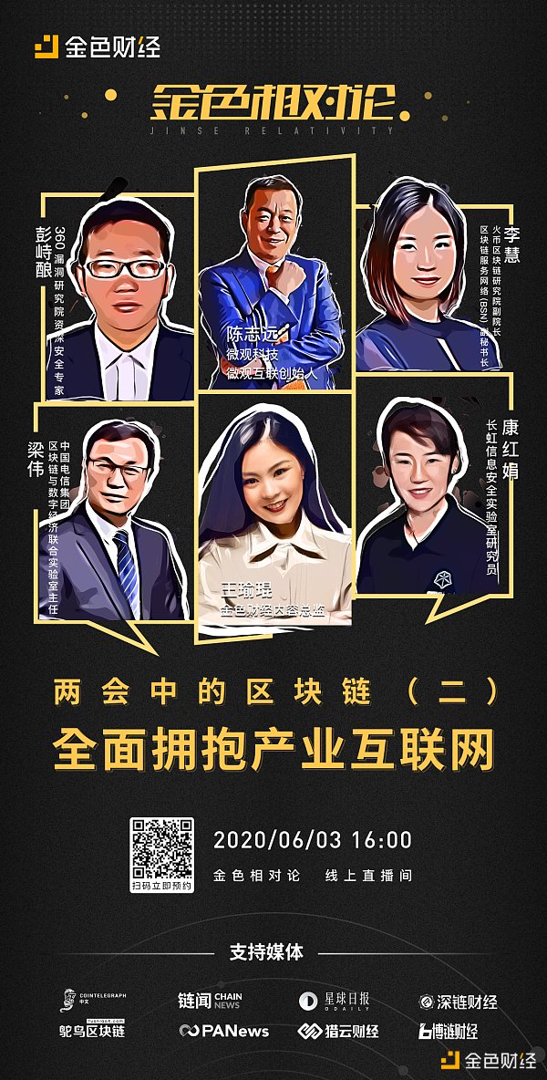6月3日16:00,金色財經舉行「兩會系列專題」第二期,特邀請長虹信息安全實驗室研究員康紅娟、中國電信集團區塊鏈與數字經濟聯合實驗室主任梁偉、360漏洞研究院資深安全專家彭峙釀、微觀科技微觀互聯創始人陳志遠、火幣區塊鏈研究院副院長李慧做客「金色相對論」,講述區塊鏈產業落地情況。本次直播主題為“ 兩會中的區塊鏈:全面擁抱產業互聯網”。