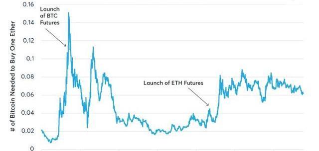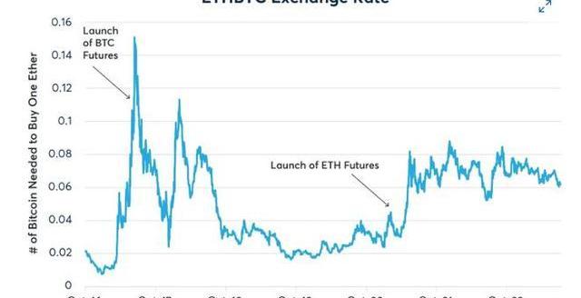 與美元相比,加密資產的波動性極大,盡管其波動程度隨著時間的推移而下降。過去一年,BTC每日價格變動的年化波動率為42%。ETH日波動率一直在59%左右。因此,在BTC上漲的日子里,ETH往往會上漲得更多。當BTC下跌時,ETH往往下跌幅度更大。高度相關性意味著ETHBTC的波動性應該比BTC或ETH單獨的波動性要小,自2017年底推出BTC期貨以來就是這種情況。在過去的一年里,ETHBTC的波動性已降至約為30%。比BTCUSD少四分之一,比ETHUSD少一半。