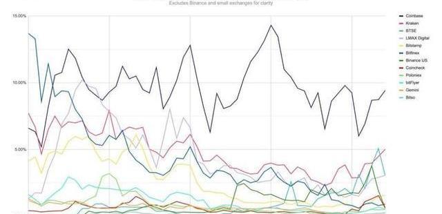 7、六月各大加密貨幣交易所的現貨市場份額排名如下:幣安為73.6%、Coinbase為9.4%、Kraken為5%,BTSE和LMAXDigital均為3%。