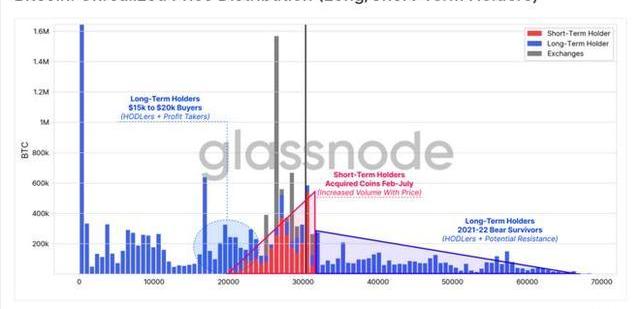 藍色部分:幾乎所有買入價格超過3萬美元的比特幣都由長期持有者持有。這些投資者要么是2021-2022年熊市的幸存者,要么是身經百戰的HODLers,要么是準備在價格反彈時進行拋售的人。