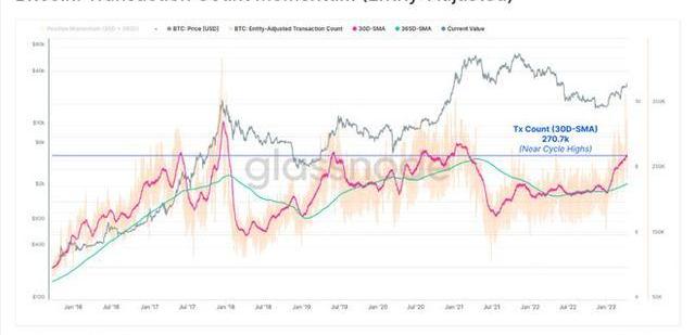 雖然HODLers通常與硬幣休眠有關,但比特幣網絡仍然非常活躍。有機交易量現在超過27萬筆/天,接近周期,月均交易量高點。