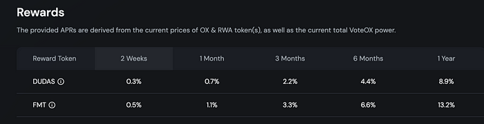 2023年6月1日Open Exchange(OPNX)推出治理代幣OX和對應治理平臺The Herd。OX的質押時間有2周、1月、3月、6月、1年五個選項,與curve類似的,質押時間越長得到voteOX數量越多,對應質押權益越大。