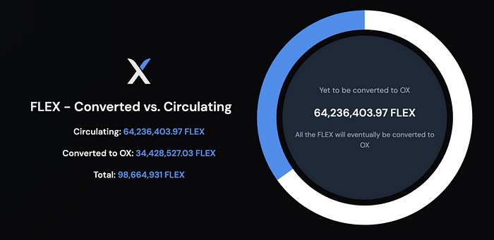 $FLEX可以選擇把$FLEX按照1:100的比例轉換為$OX,若轉換時選擇鎖倉三個月,則可以獲得25%的獎金,1:125的優惠兌換比例將在2023年8月28日目前有約35%的$FLEX被轉換為$OX。