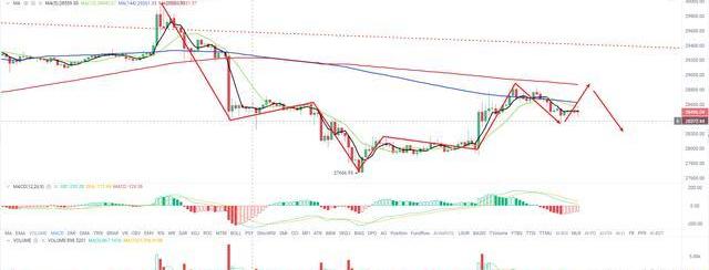 昨天分析到:大餅btc行情處于30min級別反彈中,其壓力位置在2.89w區域。從今天白天看,昨晚夜里3點多的高點反彈高位2.888w,符合昨天分析預期走勢,那么接下來主要就要關注,這波反彈后的回落下跌是否能夠支撐住,下方支撐位置大概在2.815w附近。如果下跌回落在該位置支撐住,后期還會給一個高點,但其最終壓力位在2.91w,這個屬于反彈非常強勢的情況。