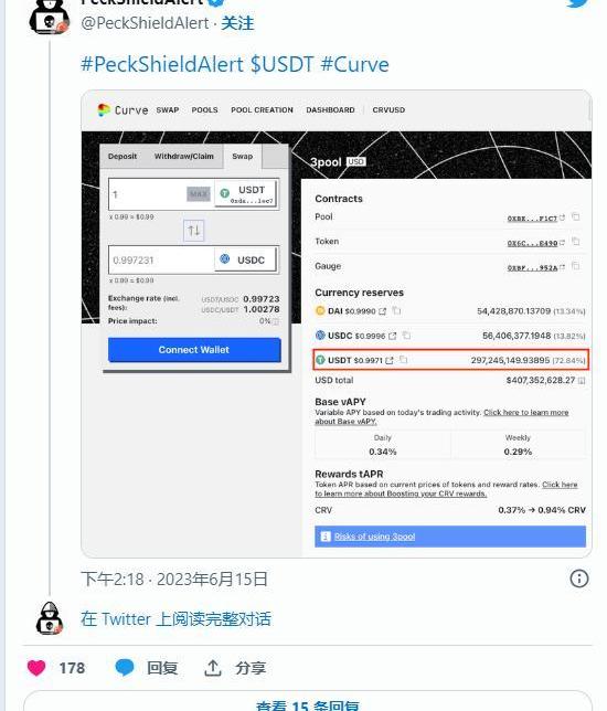 全球規模最大、市值最高的穩定幣USDT,15日晚間突然與美元微幅脫鉤(depeg),引發大量拋售潮,USDT和美元穩定幣USDC之間產生的價差,吸引套利者進場,導至去中心化金融交易所CurveFinance當中,全球規模第三大的穩定幣交易礦池3pool嚴重失衡。