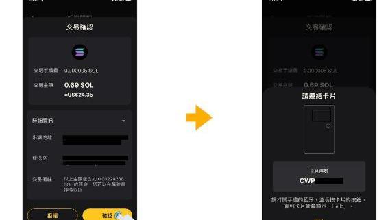 啟動后螢幕上會出現Hello,如果連接APP成功,CoolWallet會依序顯示「SOL」、「STAKE」、「質押的SOL數量」、「PRESSbutton」、「Sent」,依指示按壓按鈕,完成交易認證,即完成質押。