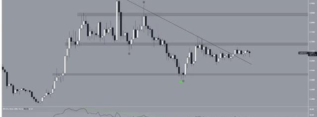 如果繼續上行,將在0.69美元處遇到強勁阻力。這是0.84美元高點之前的最后一個阻力區域。然而,如果反彈失去動力,SAND價格可能會跌至下行阻力線,并可能跌至0.53美元的水平支撐區域。與MANA類似,每日RSI略高于50,這是不確定趨勢的跡象。然而,完成的ABC回撤和從阻力線的突破使得突破的可能性略有增加。
