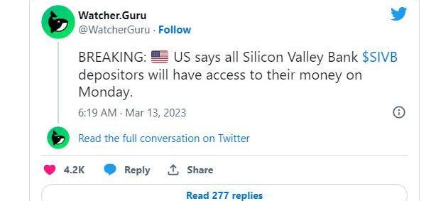 最重要的是,美國財政部珍妮特·耶倫宣布,SVB客戶將在銀行周一開門時取回他們的存款。因此,由于所有存款人的錢都是安全的,并且會及時退還,因此危機暫時可以避免。