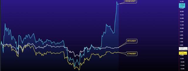 下圖顯示了比特幣(BTC)、以太坊(ETH)和狗狗幣(DOGE)之間的價格比較。