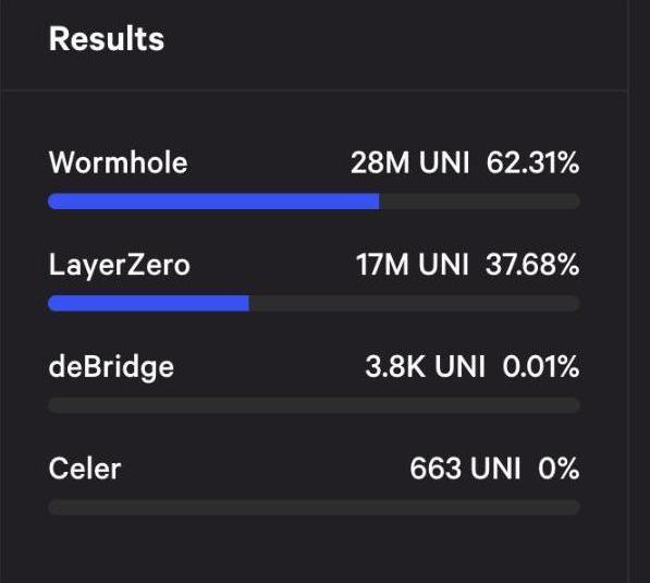 但這當然不是最終結果,因為a16z并未投票。要知道,A16z擁有1500萬個UNI代幣,他們為何不投票?難道不支持LayerZero嗎?