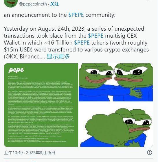 PEPE幣的官方Twitter賬戶發布了一份聲明,涉及將16萬億代幣轉移到加密貨幣交易所。