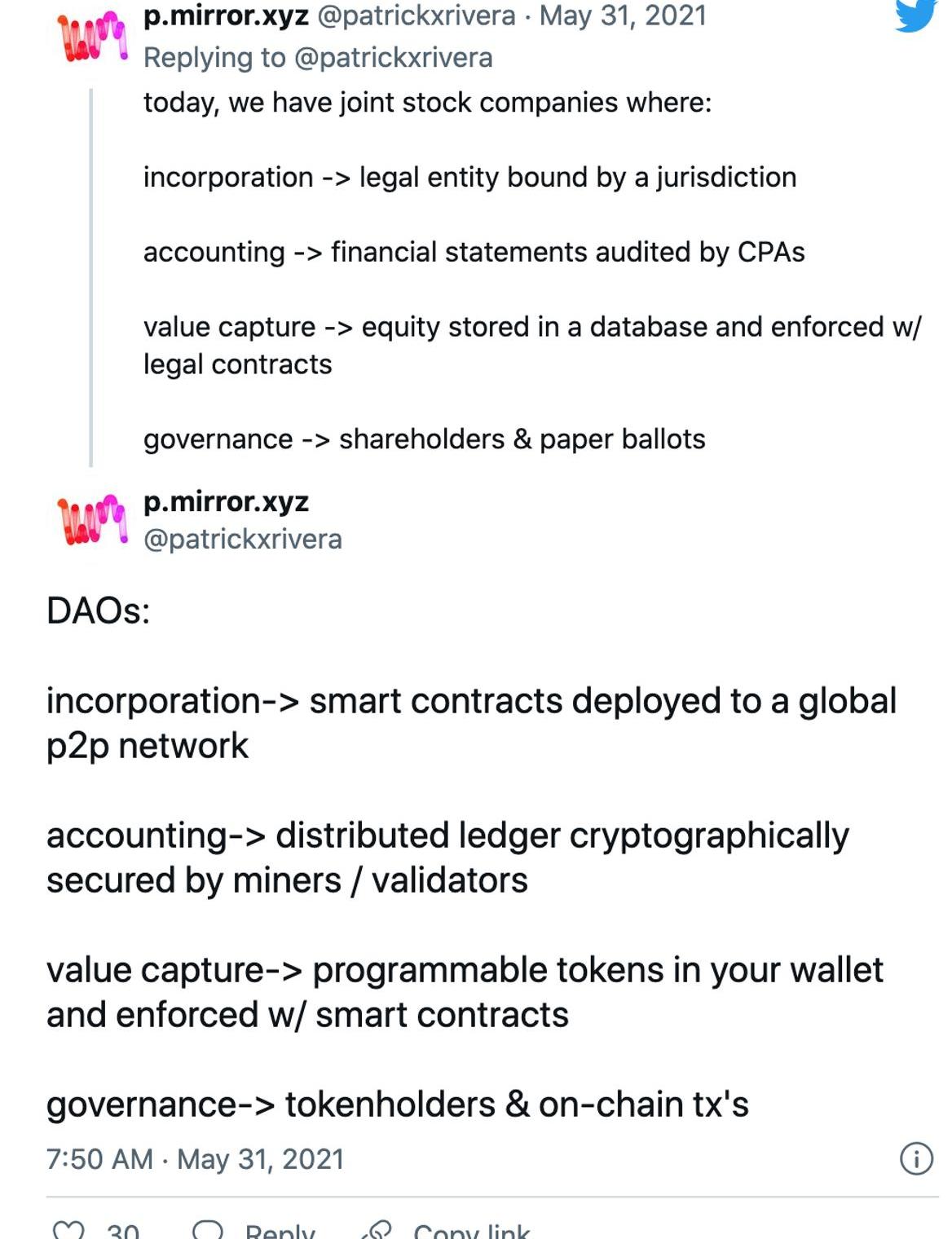 今天,我們有股份公司,其中,成立:受某一司法管轄區約束的法律實體會計:由注冊會計師審計的財務報表價值獲取:股權存儲在數據庫中并通過法律合同強制執行治理:股東和書面投票對于DAO來說,成立:智能合約部署到全球P2P網絡中會計:分布式賬本,由礦工/驗證者加密保護價值獲取:錢包中的可編程代幣并通過智能合約強制執行治理:代幣持有者和鏈上交易的治理最好的DAO工具將成為協議DAO。協議DAO的目的是創建一個自我維持的協議。對這種最終狀態的另一個很好的描述是超結構?。