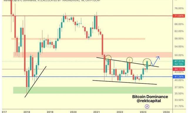 根據Rekt的說法,比特幣的主導地位是自2021年5月以來一直存在的BackWedge結構。分析師認為,比特幣的主導地位也處于確認突破該結構的有利位置,月度收盤價可能超過自5月以來的下降趨勢阻力位2021.