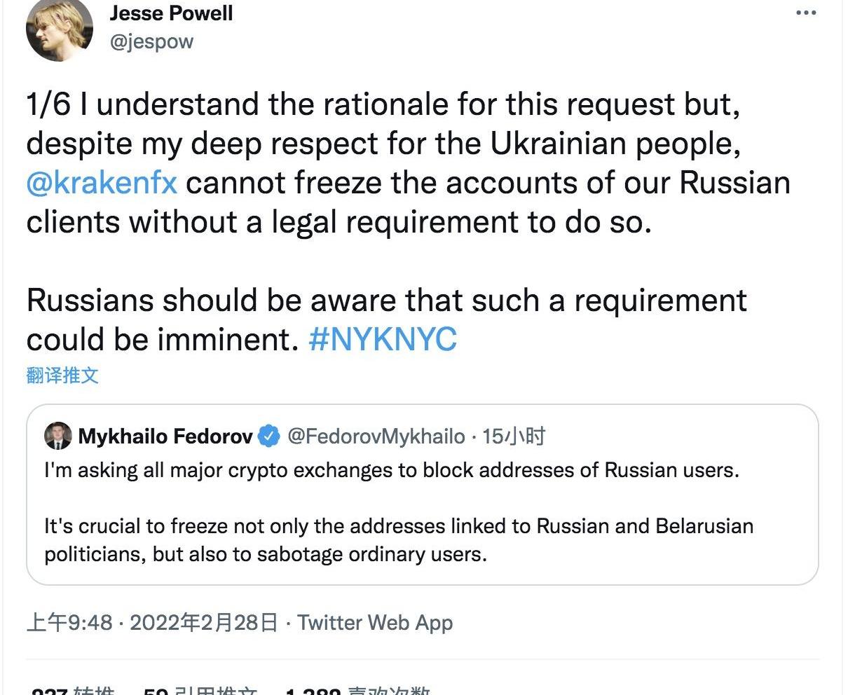 這則消息引發了軒然大波,針對這一請求,Kraken交易所首席執行官JessePowell回應稱,如果沒有法律要求,他們不能凍結俄羅斯用戶的賬戶。Powell還表示,人民的錢是人類的退出戰略,是和平的武器,而不是戰爭的武器。