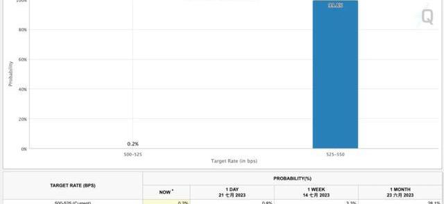 而據CMEGroup的FedWatch工具數據顯示,市場認為7月會議將再升息1碼的概率已升至99.8%,而保持不變的概率僅剩下0.2%。