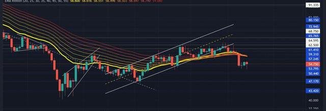 在EMA帶狀邊界附近經過短暫的壓縮階段后,加密貨幣最終在色帶下方看到看跌突破。現在,LTC在53.7美元附近找到了直接支撐。