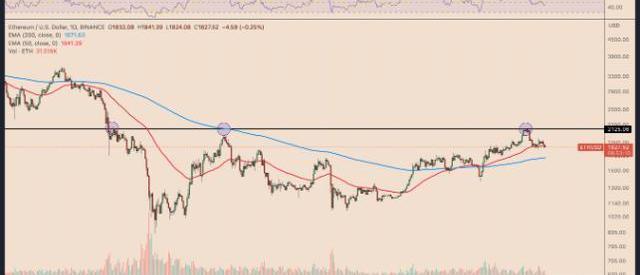 相反,如果跌破50日均線,則有可能將ETH推向1,670美元附近的200日均線,較當前價格水平下跌約10%。