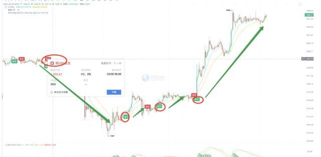 即是EMA12和26,金叉的位置看多,死叉的位置看空,周期選擇1h或者30min。