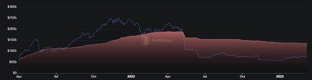 穩定幣對于整個加密市場的重要性不言而喻,它很大程度上也是反映牛熊的一個晴雨表。在2022年4-5月的時候穩定幣市值達到峰值接近190B,隨后一路下行,當前穩定幣市值135B。穩定幣市值反映出資金進出場的情況,換句話說也就是市場的流動性情況,這與整個市場牛熊周期契合度很高。