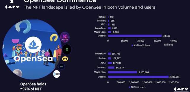 在加密貨幣存在的短暫時間內,水平市場享有最多數量和用戶。處于山頂的是OpenSea,它以97%的市場份額主導著這個生態系統,使其成為各種收藏品和藝術品的事實上的水平市場。即使在熊市,他們的地位也是無可比擬的。其他橫向市場也擁有大量的用戶,交易量可觀,并在市場排名中名列前茅。