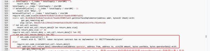 我們在反編譯的代碼中可以看到該合約使用的ERC777協議,會查詢recipient的回調合約并回調tokensReceived()函數用以重入攻擊。