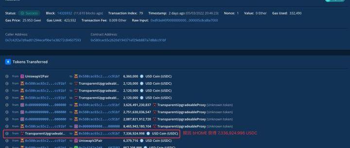 3.將剛才重入獲得的bHOME拿去銷毀贖回獲得7,336,924.998USDC。