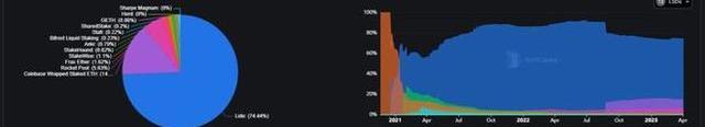 另一方面,DefiLlama數據顯示,有790萬個ETH已被抵押在流動性ETH抵押協議上。由于這些協議中的提款選項是開放的,因此這些協議中的ETH數量每天都在變化。Lido的份額最大,為74%,其次是CoinbaseWrappedStakedETH,份額為15%,RocketPool份額為5.6%。
