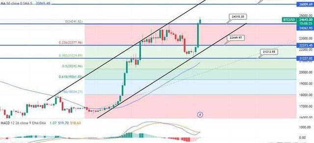 另一方面,如果看跌突破24,300美元的水平,BTC價格可能會跌向22,500美元的水平,該水平受到上行通道的支撐。由于RSI和MACD指標處于買入區,BTC也形成了上行通道,因此BTC繼續看漲24,300美元水平的可能性很大。