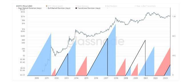通過持續時間來評估之前的比特幣市場階段很容易,以了解未來的情況。它可以通過檢查牛市、熊市和過渡期所花費的天數來設定基準。過渡階段是從一個周期的歷史最低點(ATL)開始測量,直到達到新的歷史最高點(ATH)。假設2022年11月經歷的低位沒有惡化,可以說市場已經處于過渡期227天。
