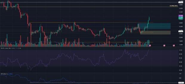 范圍從7.7美元擴大到8.8美元。在撰寫本文前12個多小時,在亞洲時段,這些高點因成交量強勁而被突破。RSI也走高以突顯看漲勢頭。