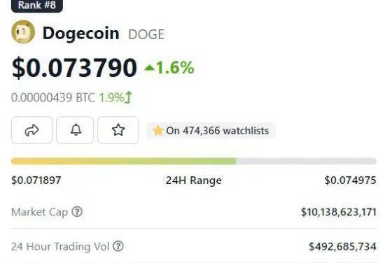 截至發稿時,狗狗幣的交易價格為0.07美元,在24小時日內交易中上漲1.6%。它比2021年5月創下的0.73美元的歷史高點下跌了89.9%。