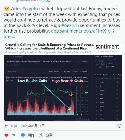 現在,市場參與者似乎已經熟悉了當前的趨勢,因此相信比特幣價格在盤整一段時間后肯定會下跌。根據知名鏈上平臺Santiment的數據,交易者現在正在尋找更好的買入機會,預計未來幾天價格將從27,000美元跌至29,000美元。