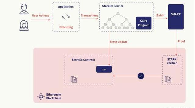 在整個過程中,用戶與應用的交互在鏈下進行,應用向StarkEx服務器發送交易的過程在鏈上進行。