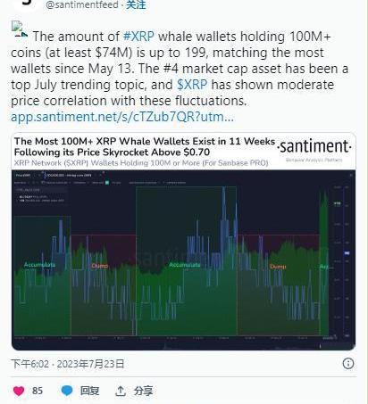 根據專注于2,500多種加密貨幣鏈上分析的領先市場情報平臺Santiment的一份報告,持有1億或更多XRP的鯨魚錢包已大幅增加至199個。